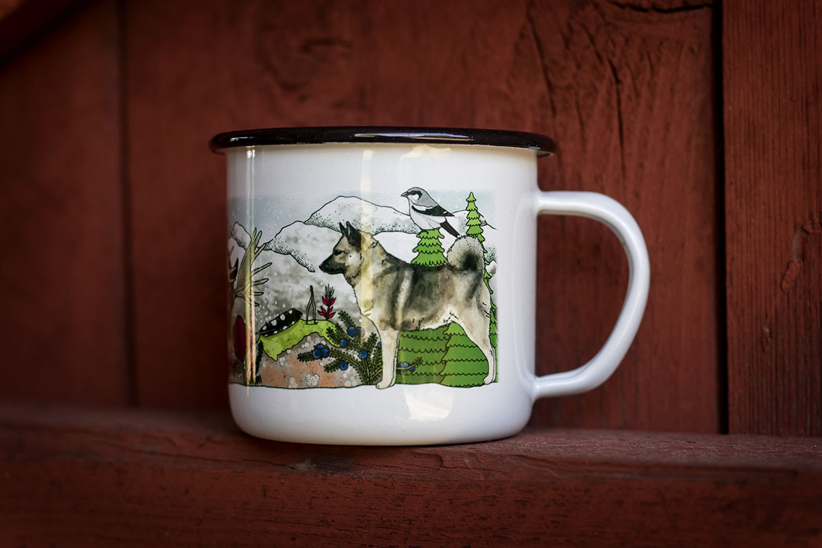 Emaljekrus fra svenske eplaros med motiv af Gråhund. Emaljekruset er 8 cm høje og 8 cm i diameter og rummer ca. 30 cl. Kruset har en sort kant.