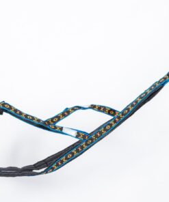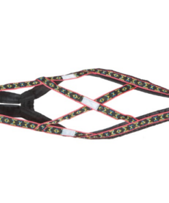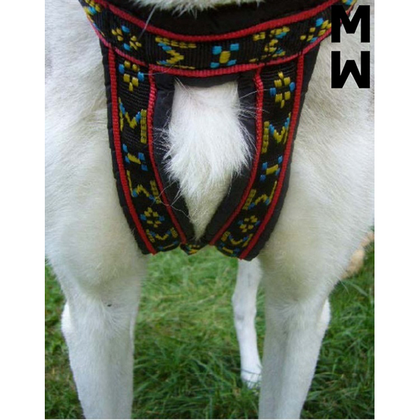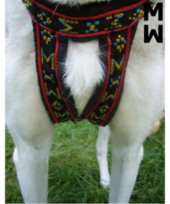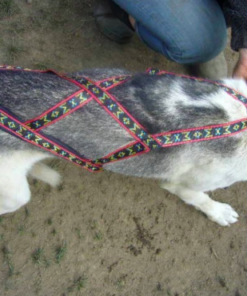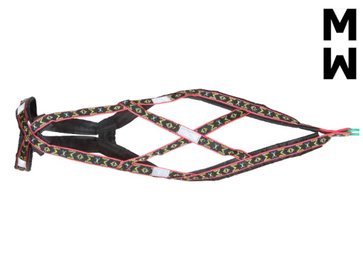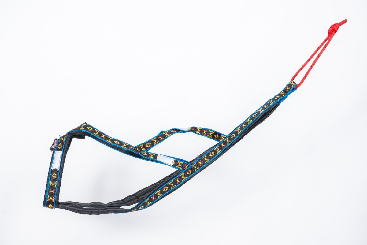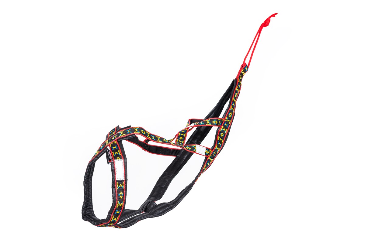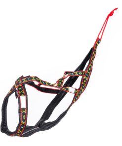 Specielt konstrueret hals åbning og bryst plade holder denne sele centreret om hundens bryst. Selen har en “krave” som minimerer pres på hundens hals, trækkraft er hovedsagelig fordelt til siderne af denne “krave”. Lavet ud af 1 tomme bred letvægt, ekstremt holdbart webbing. Polstring er lavet af letvægts skum dækket i en rip-stop-shell. Polstring strækker sig langs selens fulde længde. Webbing er en multi farvet design på en sort baggrund.