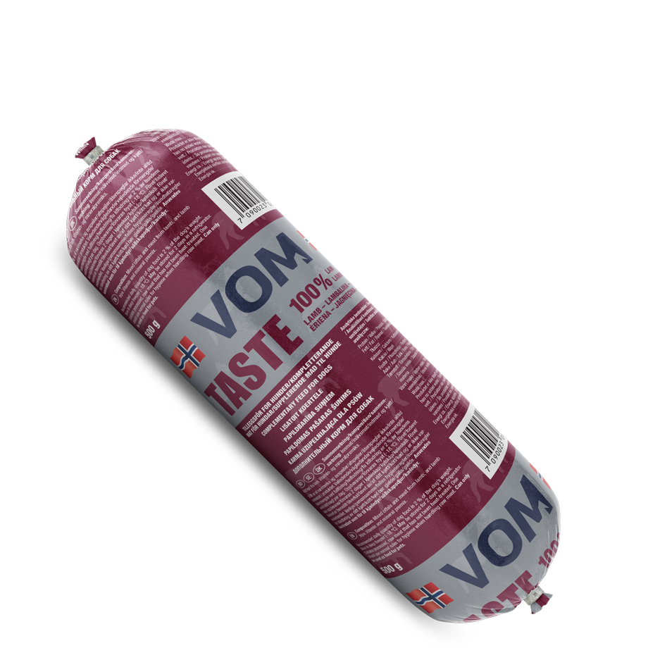 VOM TASTE Lam er et nyt produkt og består af blandet indmad og kødafskær fra lam samt lammemave. Produktet har særdeles god smag og er en sikker vinder hos hunden.